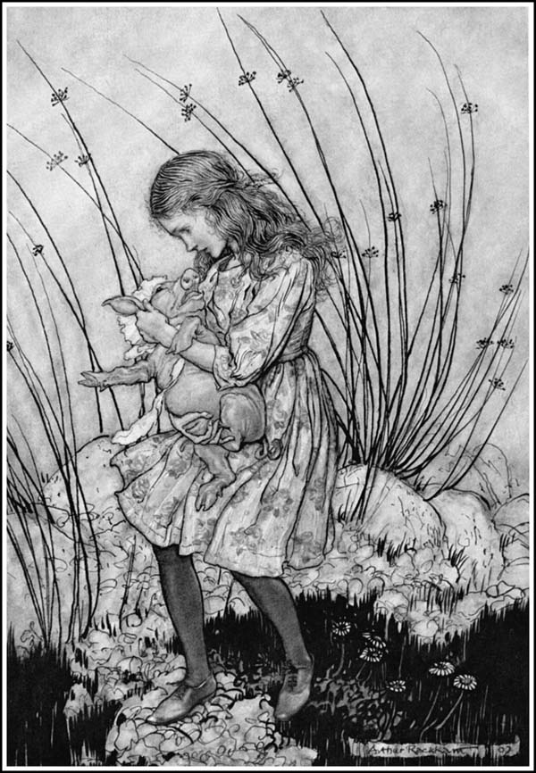 А вот Алиса Артура Рэкхема, напротив, хотя и старше на вид, оказывается неврастеничной декаденткой с глазами, полными слез. Внешне она очень похожа на полупрозрачных девушек из мифологических картин Берн-Джонса (с поправкой на подростковую нескладность и угловатость). Чудесное путешествие пугает ее. Она слишком слаба, чтобы навязывать окружающим свои правила игры, да и игрок из нее, скажем прямо, никакой. Трактовка Алисы Рэкхемом очень отличается от кэрроловской, и значит хотя бы то, что художник воспринимал героиню всерьез, т. е. как нечто, заслуживающее свежего взгляда. Кстати, интересно было бы выяснить, когда «Алиса в Стране чудес» становится предметом культа и начинает порождать многочисленные интерпретации образа героини и локаций ее путешествия. Странным образом, новое отношение к сказке Кэрролла возникает довольно поздно, о чем можно судить по уровню иллюстраций к разным изданиям «Алисы в Стране чудес». Так, в промежутке между Рэкхемом (1907) и Мервином Пиком (1946) к сказкам Кэрролла не обращался ни один иллюстратор из тех, кого можно назвать первоклассными. Более того, перечисление художников, которые могли бы проиллюстрировать «Алису в Стране чудес», но по каким-то причинам не стали этого делать – от Д. Г. Россетти до Эдварда Гори – тоже способно навести на любопытные размышления.