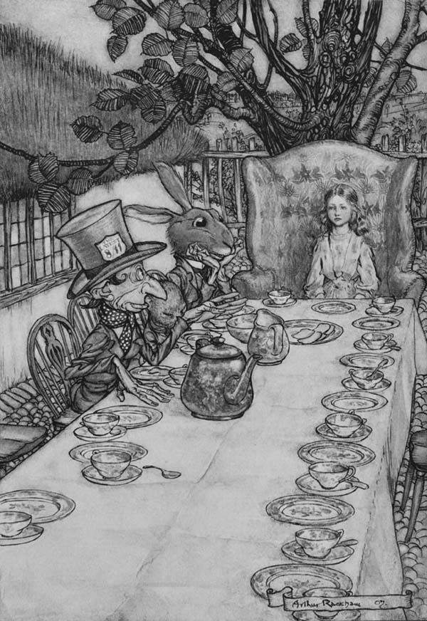 Здесь стоит заметить, что сцена Безумного чаепития не сводится к чистому абсурду. В Мартовском Зайце можно увидеть философа и акциониста, протестующего против социальной функции исчисления времени. Но и загадка («Чем ворон похож на конторку?»), которую загадывает Алисе Болванщик, тоже имеет некий подтекст. Тем более, что «самой высокой мудростью [в архаических культурах] считается умение задать такой вопрос, на который никто не смог бы ответить»[6]. Согласно Йохану Хёйзинге, загадки отсылают к священному знанию об устройстве мира, поэтому, если A похоже на B, то их сходство вскрывает какие-то глубинные принципы мироздания. Но и абсурду здесь найдется законное место. «Ответ на вопрос загадки, – добавляет Хёйзинга, – не может быть найден путем размышлений или логических рассуждений. Этот ответ есть некое разрешение, внезапно открывшаяся возможность разорвать узы, которые наложил на вас тот, кто задал вопрос. Отсюда и то, что правильное решение тотчас же лишает силы спрашивающего»[7]. Что же делает Алиса? Подобно Александру Македонскому, разрубившему Гордиев узел, она ломает сценарий игры, предлагаемый Болванщиком, т. е. ведет себя как типичный колонизатор. А для любого колонизатора, как для представителя рационального brave new world, священное знание колонизируемых оказывается не более, чем этнографическим курьезом.