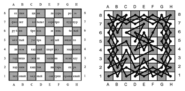 [одинъ] Отецъ и [одинъ] сынъ, [одинъ] учитель и [одинъ] ученикъ. — Мать здѣсь, а дочь тамъ. — Тамъ братъ, а здѣсь сестра. — Отецъ и Сынъ здѣсь. — Мать и сестра тамъ. — [одинъ] Ученикъ и [одинъ] учитель. — Тамъ и здѣсь. — Отецъ и братъ здѣсь, а мать и дочь тамъ. —