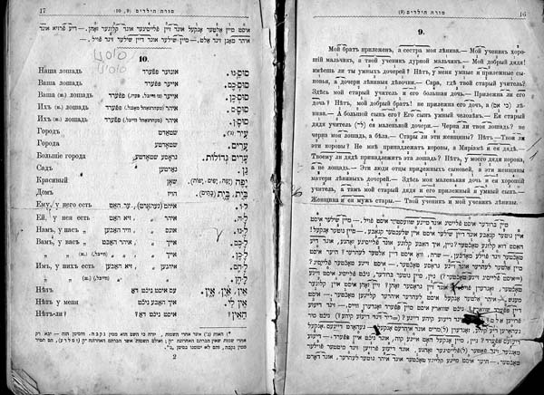 Зачѣмъ ты не посылаешь мнѣ моей книги которая у тебя? Моя сестра еще читаетъ ее, ибо разсказы которые въ ней очень нравятся ей (=очень хороши въ ея глазахъ). — Твоя маленькая сестра лежитъ лицомъ внизъ (=на ея лицѣ) въ ея кровати, и кричитъ громкимъ (=великимъ) голосомъ; развѣ твоя мать не слышитъ ея голоса? да, но моя мать знаетъ, что ея маленькая дочь любить всегда кричать, потому она не идетъ къ ней. — Кто зоветъ меня? Твоя тетя зоветъ тебя, чтобы прочитать ей (=читать въ ея ушахъ) письма ея мужа, ибо она больна глазами, и она не читаетъ писемъ ночью. — Не знаете ли вы, гдѣ здѣсь врачъ? вотъ онь живетъ въ домѣ, который между тѣмъ садомъ и (между) нашимъ полемъ. — Наша умная мать оберегаетъ насъ отъ дурныхъ товарищей, и потому она выгоняетъ (посылает) всегда вонъ (=изъ нашего дома) сыновей нашего сосѣда, и мы слушаемся ея и не ходимъ съ ними, и не сидимъ возлѣ нихъ. — Зачѣмъ вы вырываете цвѣты изъ нашего сада, вы дурныя дѣвочки? мы очень любимъ цвѣты, и у насъ нѣтъ сада, потому мы беремъ цвѣты вашего сада. — Но развѣ вы не знаете, дѣвушки, что Богъ не любить людей берущихъ вещи, которыя не принадлежать имъ? Если такъ, мы идемъ домой безъ цвѣтовъ. — Эта маленькая девочка ломаетъ все, что она ни возьметъ въ (ея) руки, и потому мать ея кричитъ на нее. — Куда ты идешь (ты) одна, моя сестра? Я иду въ городъ, ибо наша мать посылаетъ меня къ нашему дядѣ, чтобы позвать его къ намъ; но я не возьму тебя со мною, ибо ты не слушаешься твоего учителя и ты не учишься читать и писать по еврейски. — Теперь я одинъ во всемъ этомъ большомъ домѣ, и я стерегу его. — Почему ты не кушаешь яблока которое на столѣ предъ тобою? Яблоко принадлежитъ моему маленькому брату и я не беру того что не принадлежитъ мнѣ. — Эти яблока худы, и всѣ кушающiе ихъ больны. — Маленькая дочь моего дяди очень прилежна, она учится 3 языкамъ, и знаетъ также читать и писать по еврейски, потому всѣ знающiе ее любятъ ее. —
