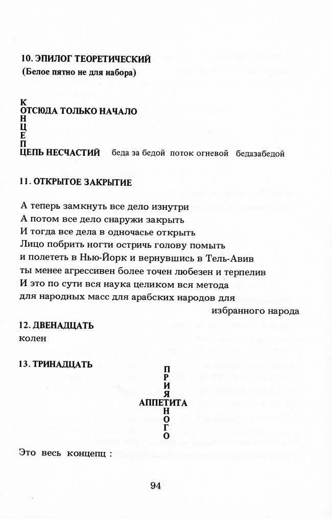 заканчиваются чем-то совсем иным — страхом, что «этот словопоток прекратят когда словопоток прекратят» щемящим чувством того, что он, этот абсурд, был годами ожидания себя, постоянным поиском себя, уточнением, и даже, более того, — почти наивной верой в грядущую не дурную, а искупающую бесконечность: